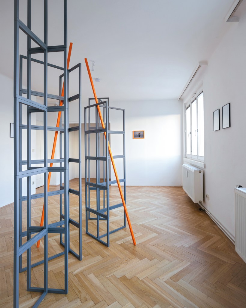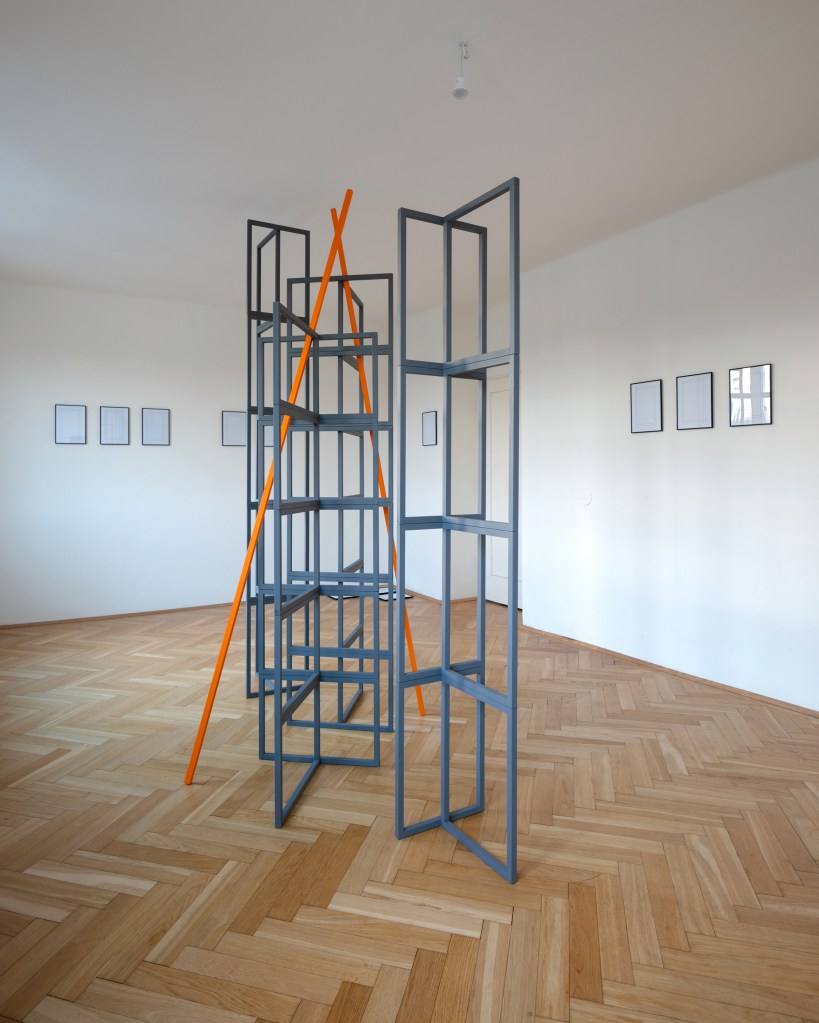 Sie ist das Resultat meiner Bestrebungen, eine Art Skulptur zu schaffen, die einerseits in der materiellen Gegenwart eines Ausstellungsraumes verankert ist, in der aber auch noch Echos aus dem medialen Raum, das Virtuelle und Transparente der Fotografie, nachklingen.