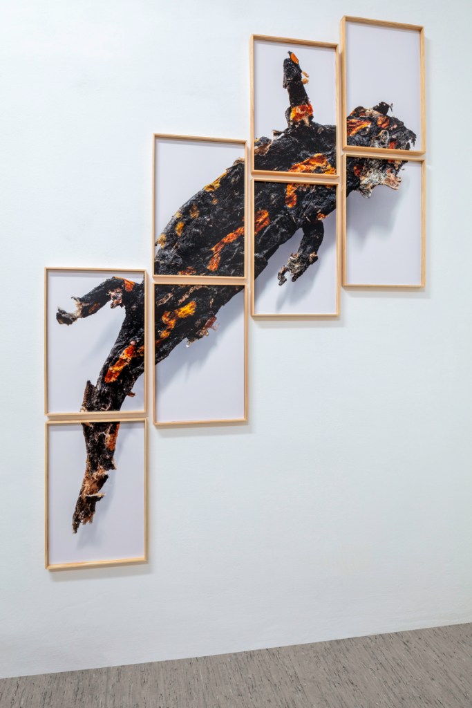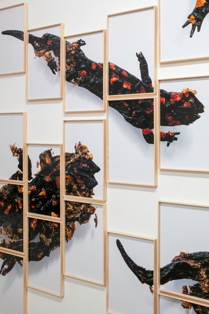 Der Salamanderraum ist eine variable Installation aus fragmentierten, stark (auf menschliches Maß) vergrößerten Fotografien der Salamander, die einerseits das Abstoßende und Skandalöse dieses Todes nicht verleugnen wollen. Andererseits war es mein Anliegen, mit dieser Arbeit den Salamandern ein Denkmal jenseits des Makabren zu erschaffen, in welchem sie, ihren eigenen Totentanz aufführend, an ihre Schönheit und Würde erinnern können.