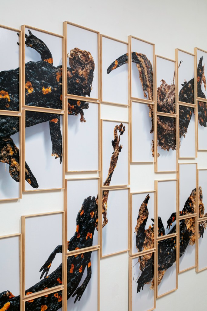 Als ich im Frühjahr 2019 bei einer Radfahrt im Wienerwald auf wenigen hundert Metern Straße mehrere Dutzend totgefahrene, dabei flachgequetschte und auf dem heißen Asphalt gegerbte Überreste von Salamandern fand, hat mich das Unwürdige eines solchen Sterbens zutiefst irritiert. Einem spontanen Impuls folgend, nahm ich die Tierkörper mit ins Atelier.